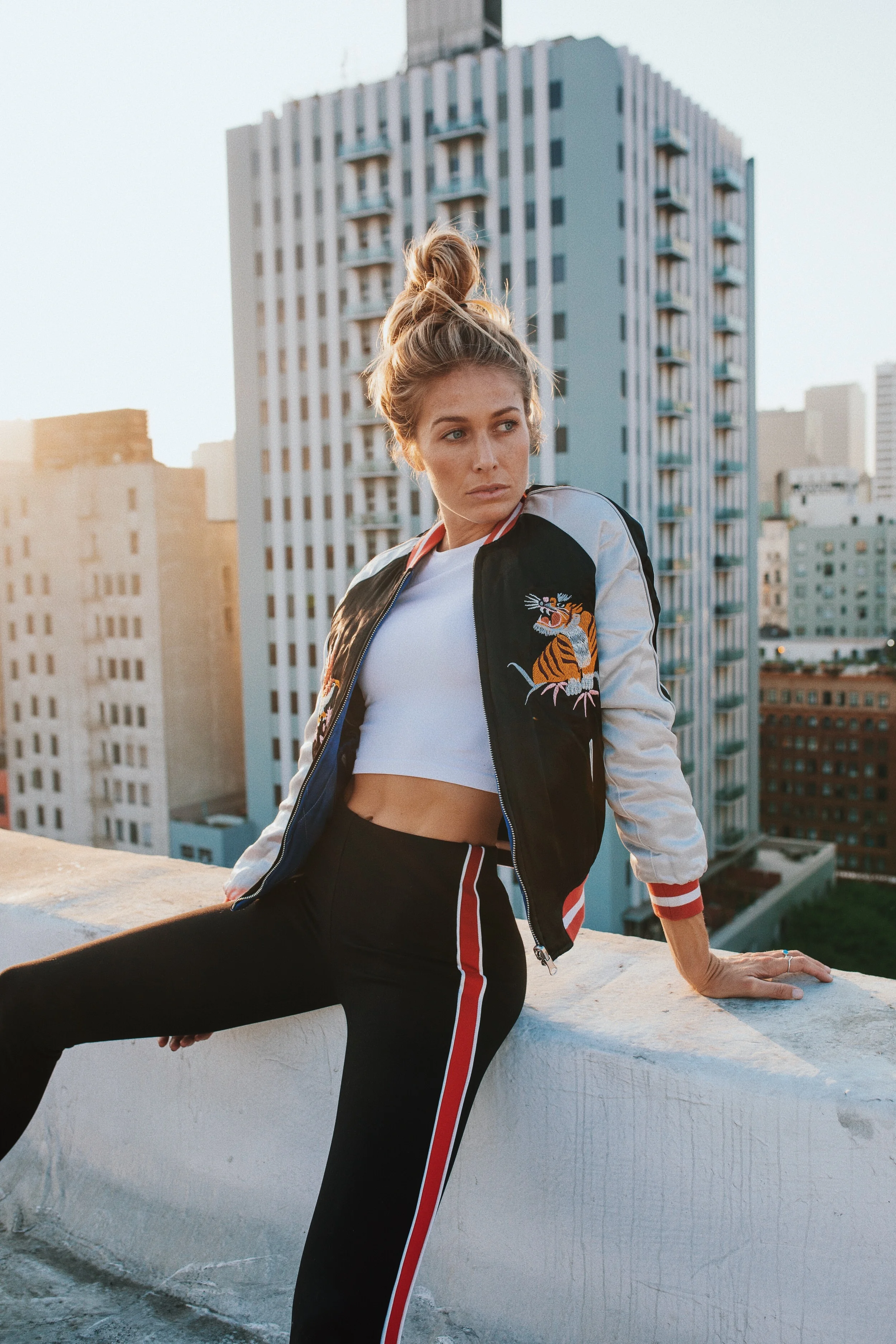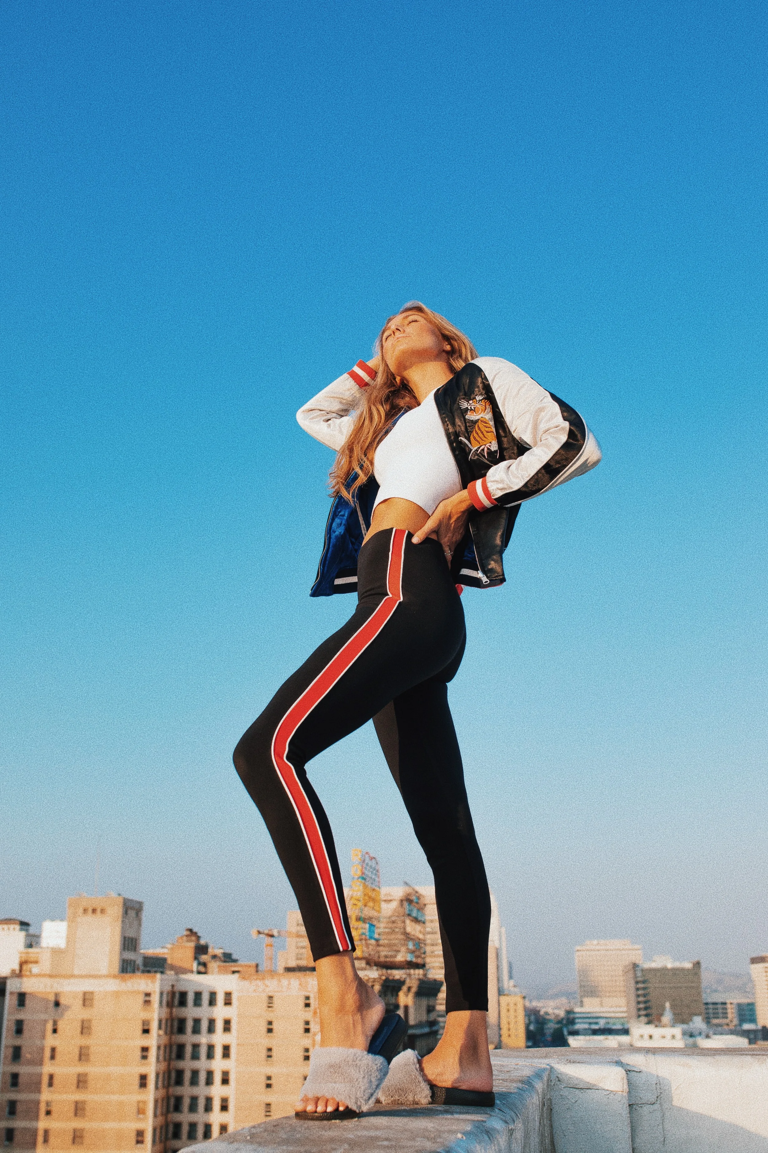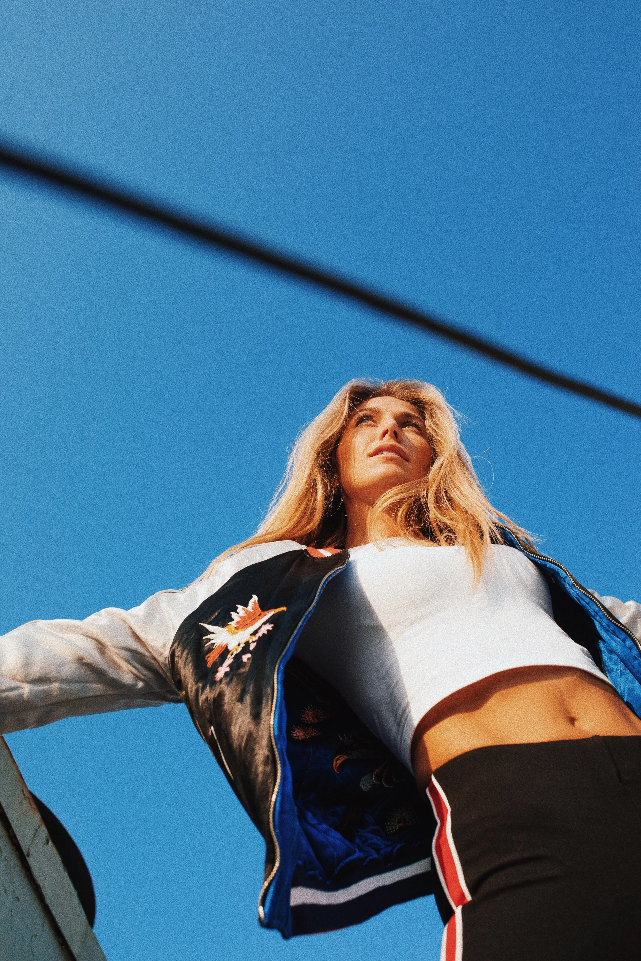 High in the sky with this sporty, casual get up...